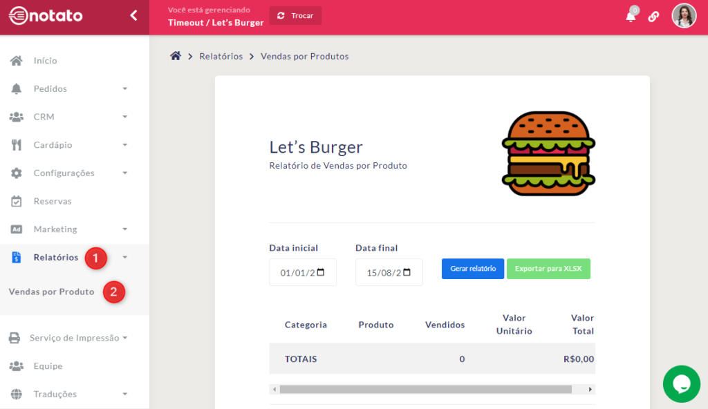 Em seguida, tanto para parques quanto para lojas, no menu principal da plataforma, clique em “Relatórios” e depois em “Vendas por Produto”.