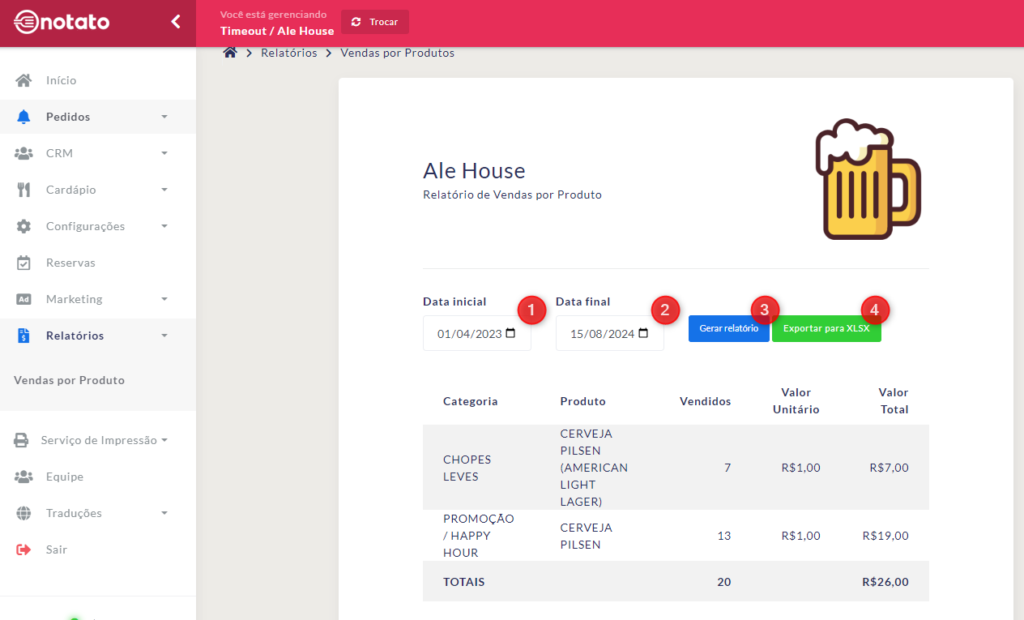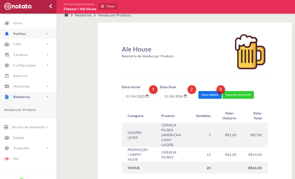 Para gerar um relatório, preencha a “Data inicial”, a “Data final” e clique em “Gerar relatório”