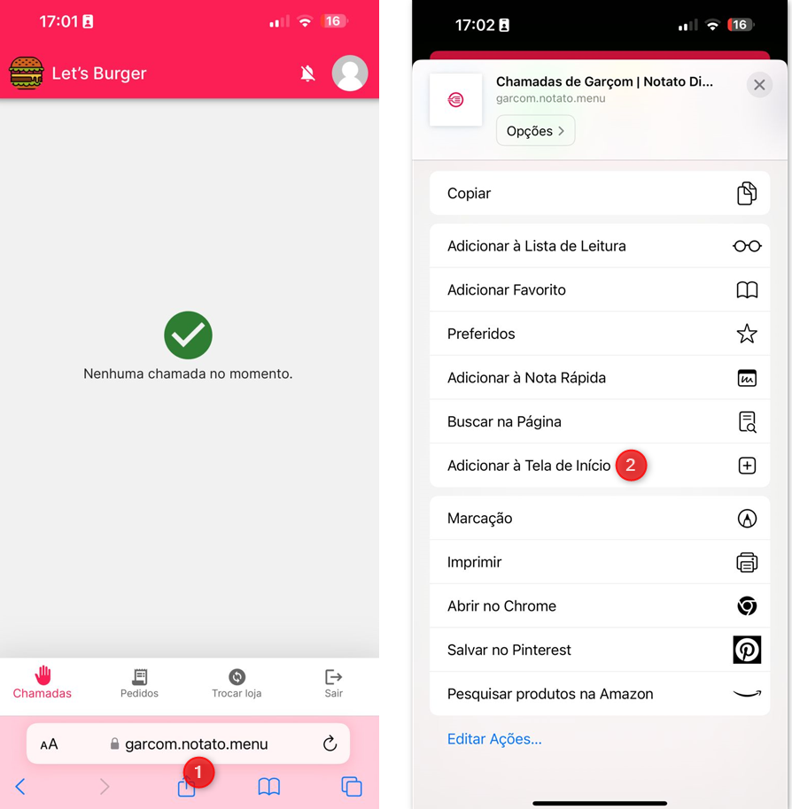 Pelo celular em que o seu garçom recebe a chamada do cardápio, você deve abrir o navegador para acessar o link: