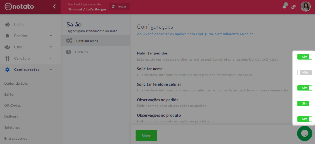 Dentro dessa área, você deve HABILITAR ou DESABILITAR os campos conforme a necessidade do seu estabelecimento, apenas clicando em “Sim” ou “Não”. Os campos que você poderá definir suas preferências são:
