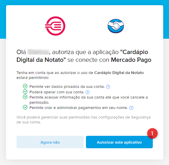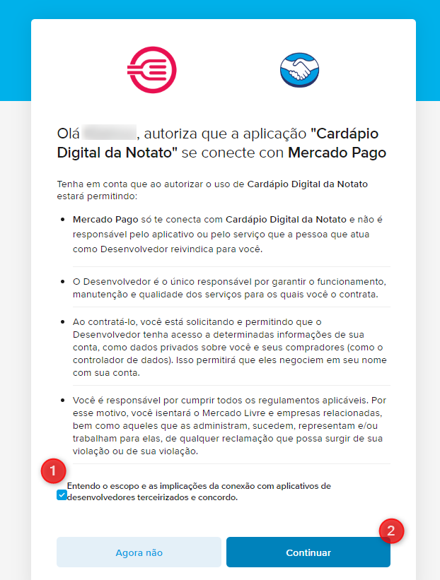 Você será redirecionado para a página do Mercado Pago, que solicitará duas autorizações antes de habilitar a plataforma.