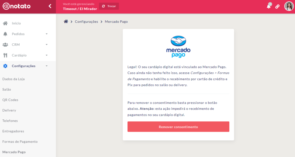 Você será redirecionado para a página abaixo na Notato, que confirma o vínculo do seu Mercado Pago com o seu cardápio digital.