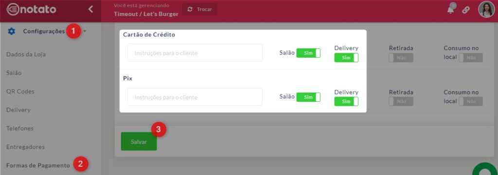 - No fim da página, habilite o recebimento por Cartão de Crédito e Pix para pedidos no salão ou delivery;