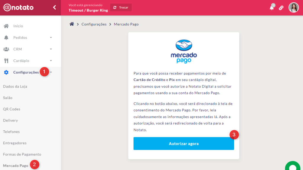 Com a conta do Mercado Pago criada, volte no menu principal da Notato, clique em “Configurações”, depois em “Mercado Pago” e em seguida, “Autorizar agora”.