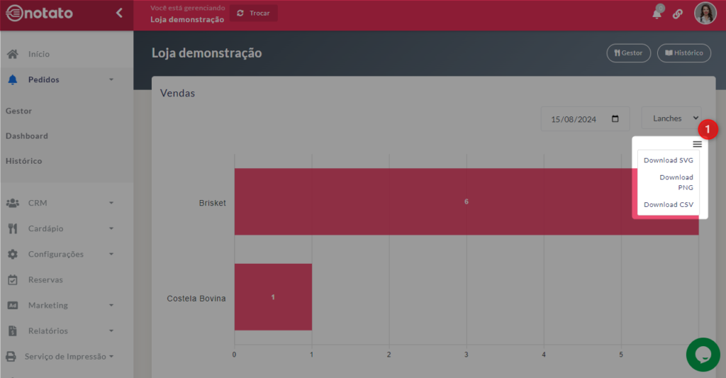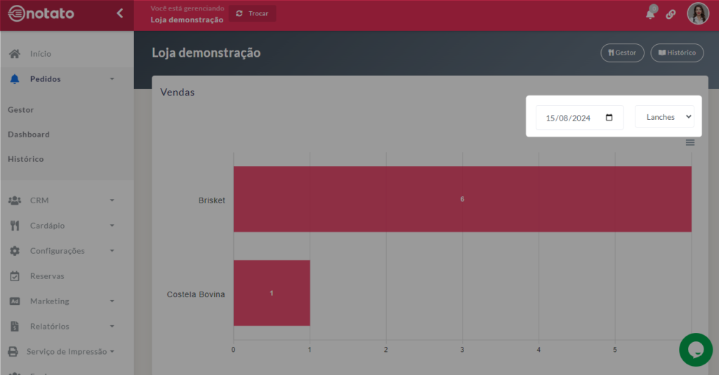 Preencha a data desejada e a categoria do seu cardápio digital que você deseja analisar, e os dados aparecerão automaticamente.