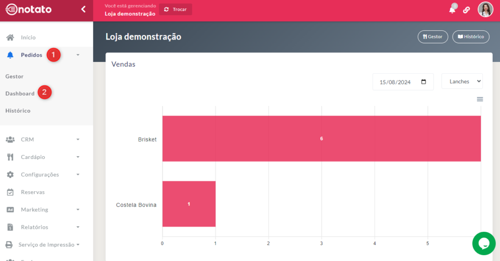 No menu principal da plataforma, clique em “Pedidos” e, em seguida, em “Dashboard”.