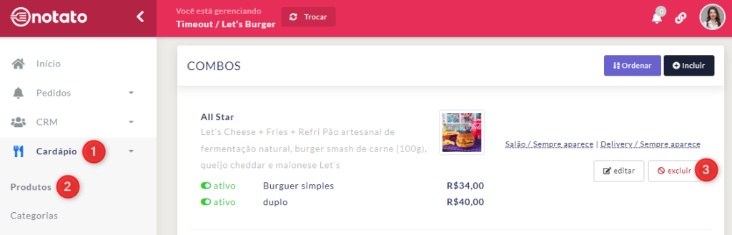 Para isso, no menu principal, clique em “Cardápio” e, em seguida, em “Produtos”. Busque a categoria que você deseja remover e clique em “Excluir” em cada produto dentro dela.