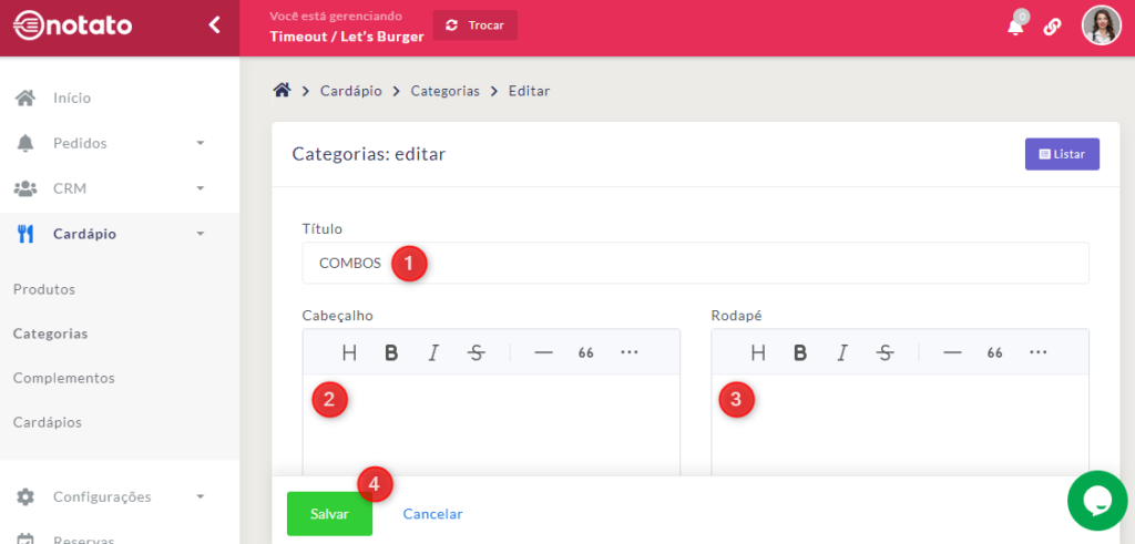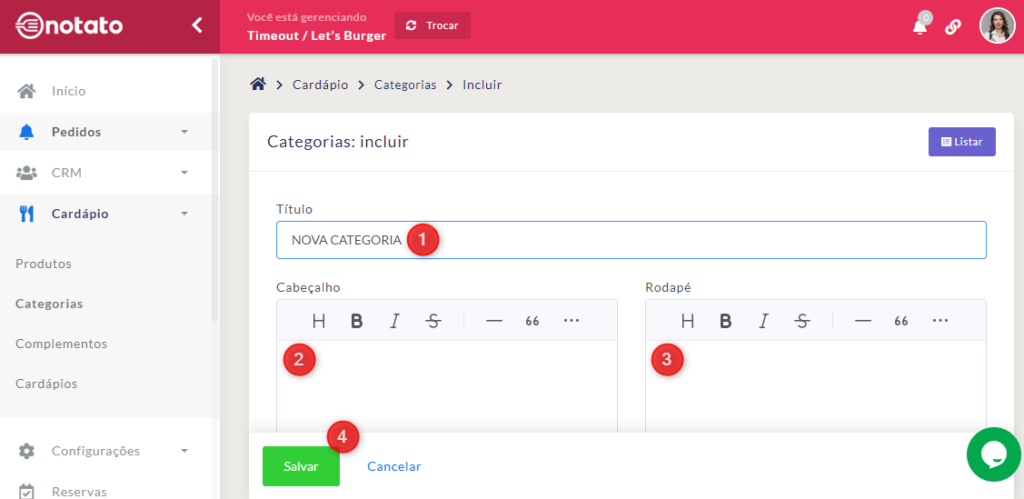 Em seguida, preencha os campos abaixo com as informações da nova categoria, e clique em “Salvar”:
