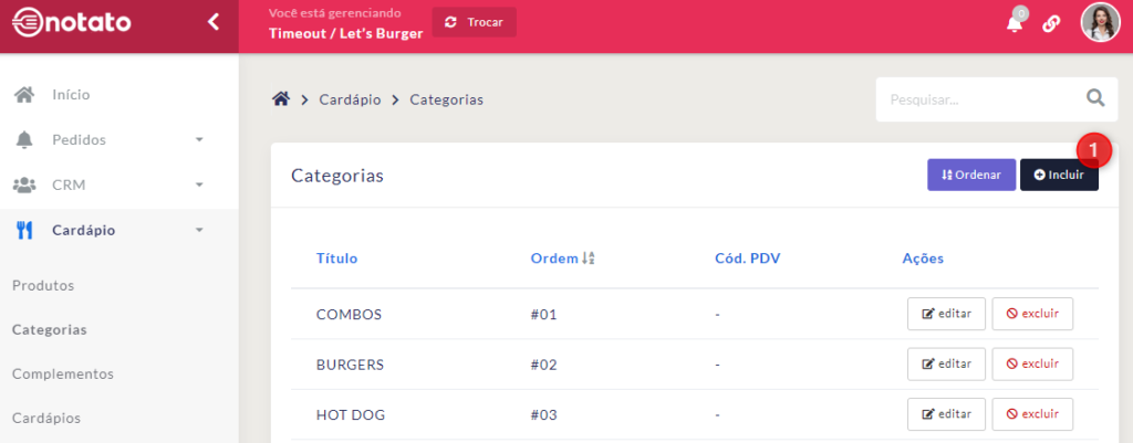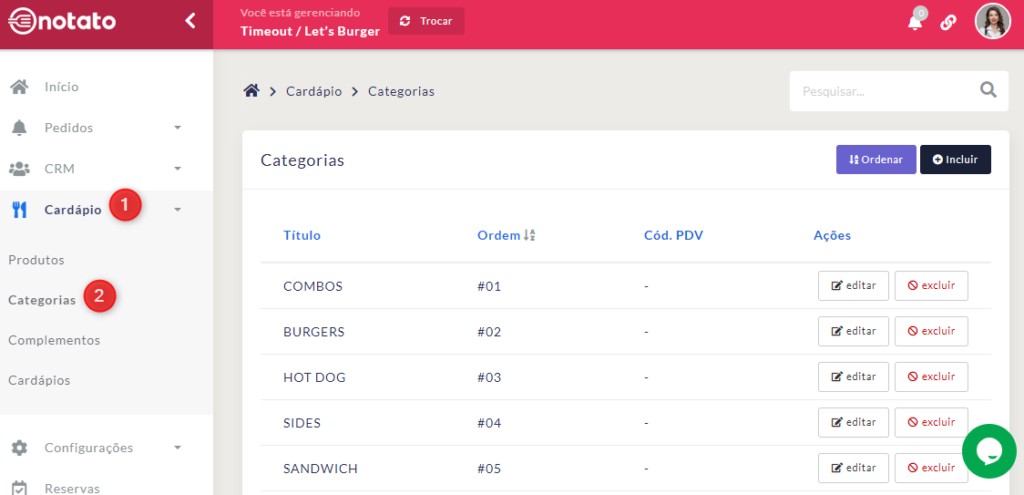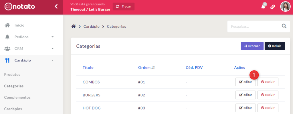 No menu principal da plataforma, clique em “Cardápio” e depois em “Categorias”.