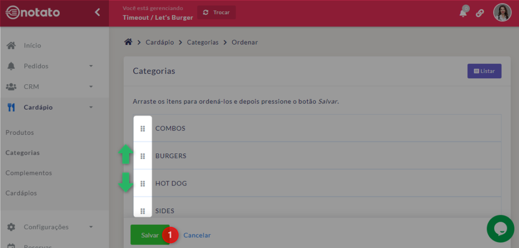 Para ajustar a ordem de aparição das categorias, basta clicar em “Ordenar” (ao lado de “Incluir”), movê-las para a sequência desejada e clicar em “Salvar” para concluir.
