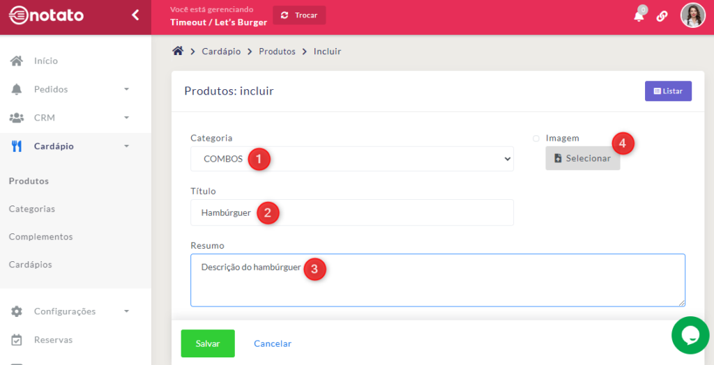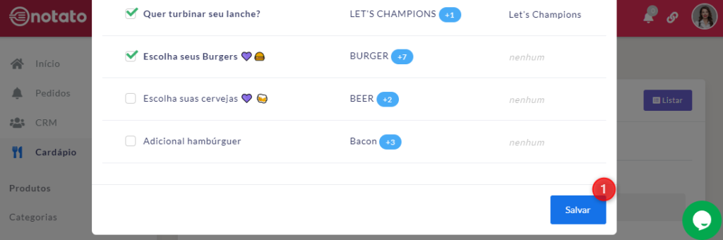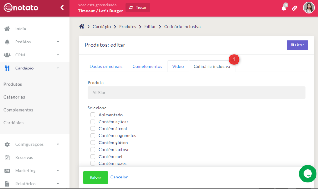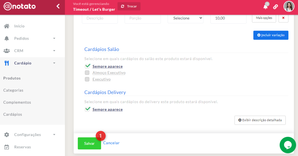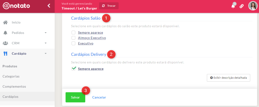 • Cardápios Salão: Selecione os cardápios dos quais este produto fará parte. Clique aqui para ver o tutorial de Cardárpios.