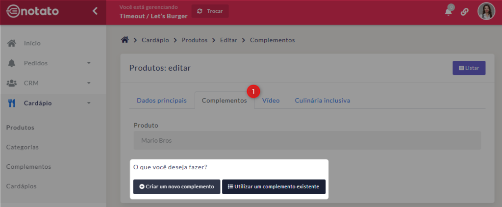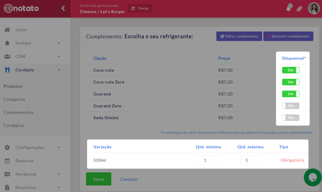 1) Os complementos podem ser utilizados em mais de um produto. Dessa forma, caso algum item falte, basta desativá-lo ou ativá-lo e ele será atualizado em todos os produtos.