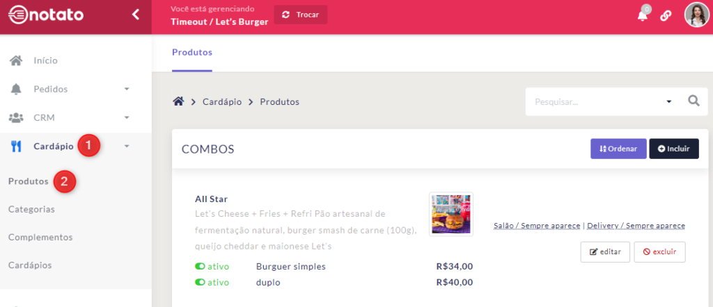 No menu principal da plataforma, clique em “Cardápio” e depois em “Produtos”.