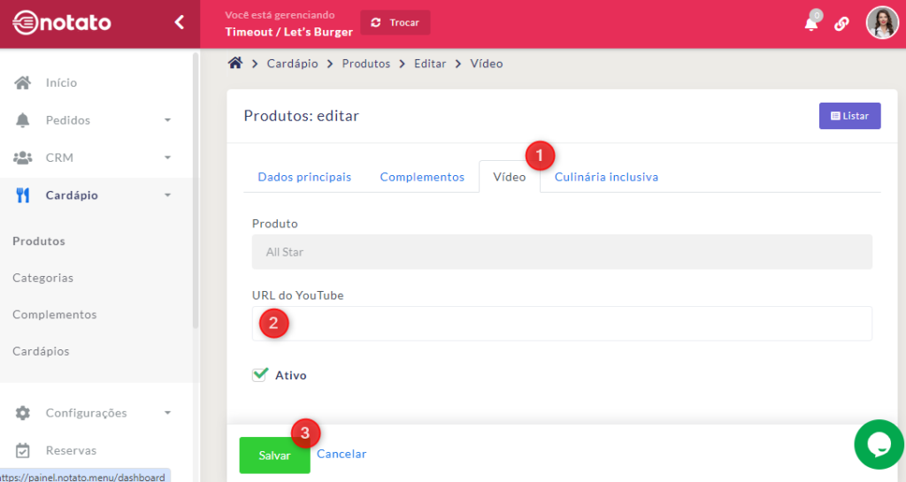 Inclua a URL do vídeo do seu produto no YouTube, e clique em “Salvar”.