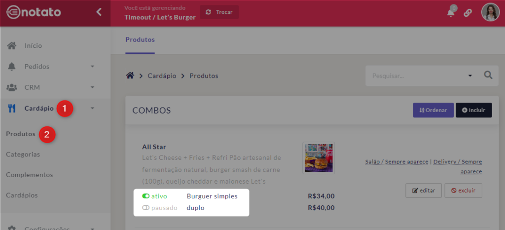 Caso algum produto não esteja disponível no seu estabelecimento, basta em “Produtos”, ativar ou desativá-lo conforme demonstrado abaixo:
