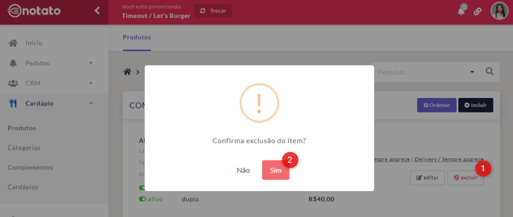 Para excluir um produto, basta clicar em “Excluir” no mesmo, em seguida, confirme a remoção.
